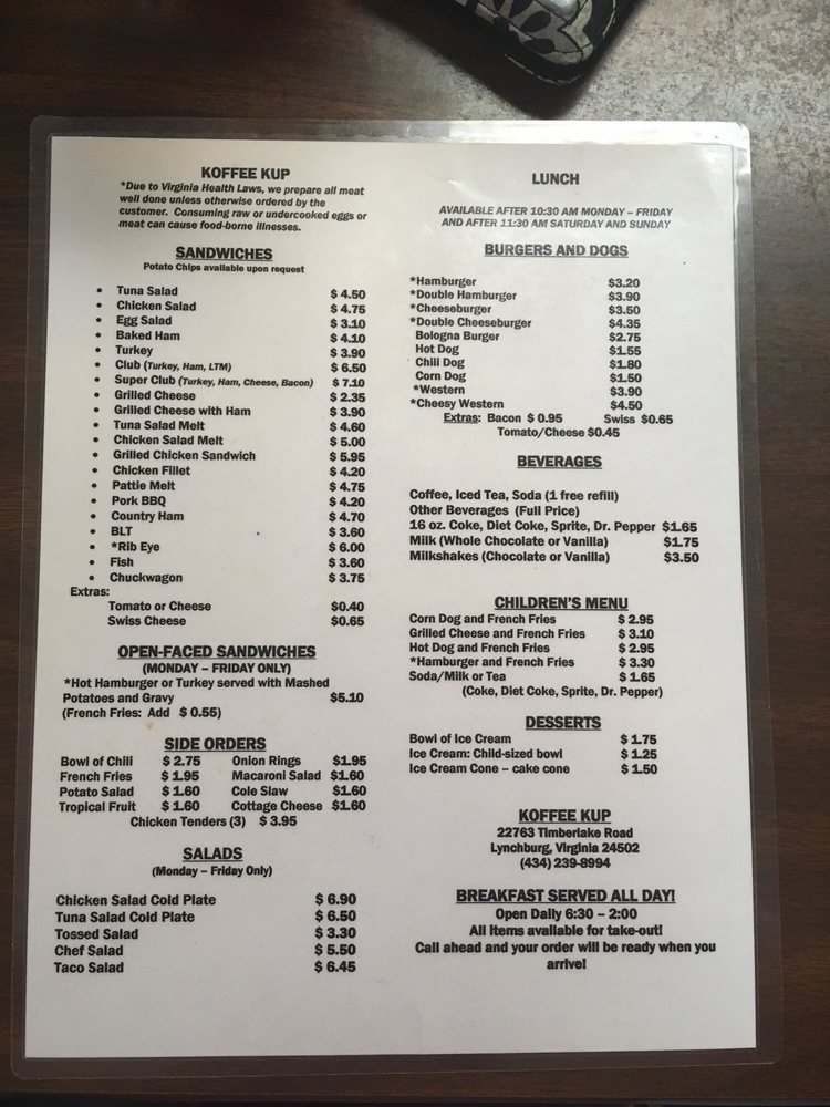 Koffee Kup is a delightful breakfast and brunch spot nestled in Lynchburg, VA, where diner charm meets a heartfelt menu. Located at 22763 Timberlake Rd, this local gem serves up an array of comforting dishes that evoke nostalgia. From hearty sandwiches like the BLT and country ham to delightful soups such as veggie, the food essence here radiates warmth.
